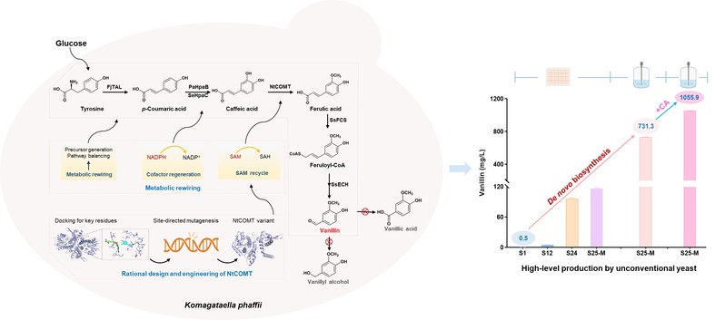 香兰素(即香草醛)被誉为“香料皇后”,广泛用于食品、医药和日化等领域,全球市场需求巨大。当前,香兰素工业生产主要以化学转化合成为主,高端应用领域的天然香兰素主要依赖于热带香草兰花豆荚中提取,产量不足、成本高昂。合成生物学技术的快速发展,使微生物细胞工厂发酵生产香兰素成为可能,为传统植物提取与化学合成提供了新的可持续替代方案。近年来,香草醛从头生物合成为其生物制造带来新机遇:在模式宿主大肠杆菌与酿酒酵母中,逐步实现基于莽草酸路径或L-酪氨酸—对香豆酸路径的香草醛合成途径构建。然而,胞内关键酶活性不足、香草醛及中间体高毒性、胞内氧化还原反应复杂等问题,严重限制了微生物细胞工厂中香草醛的合成能力。